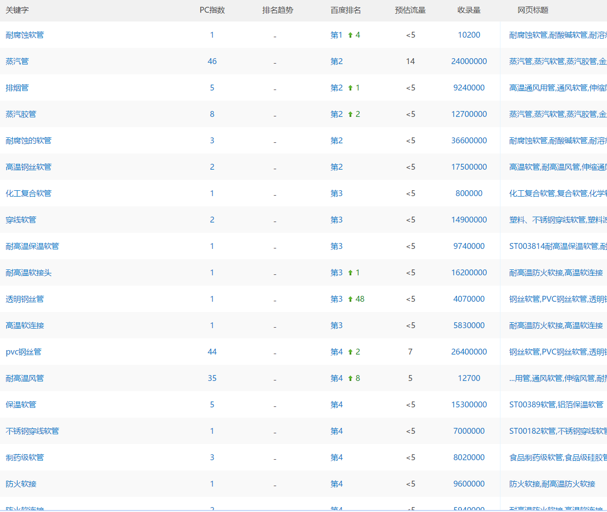 1、百度首页搜索行业词 耐高温风管,高温软管,伸缩通风软管,工业软管,电线保护防爆用管,塑料软管,塑料波纹管等核心词汇,官网均在首页。